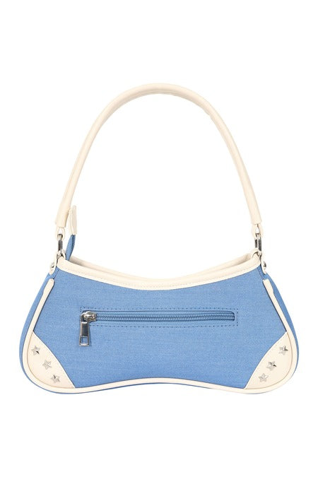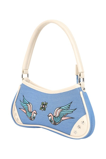 The Marilou handbag by BANNED Apparel merges vintage denim charm with rockabilly flair, featuring delicate swallow embroidery and star stud detailing. This distinctive design combines retro-inspired style with practical organization, perfect for rockabilly babes.