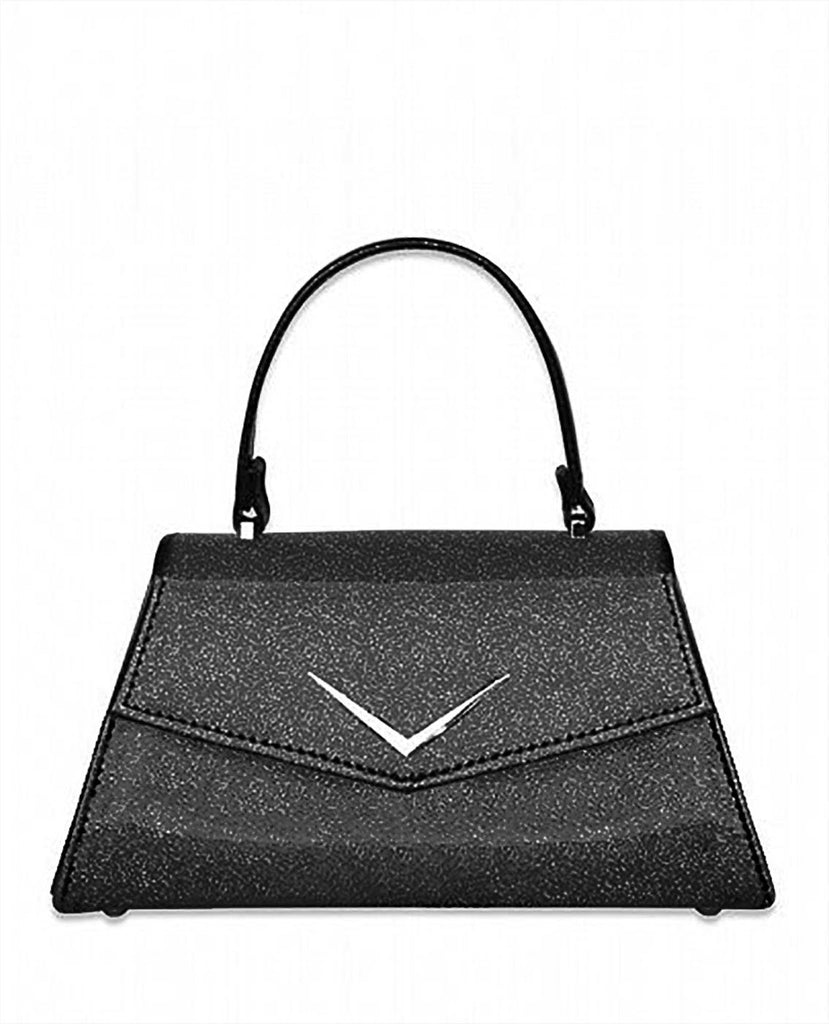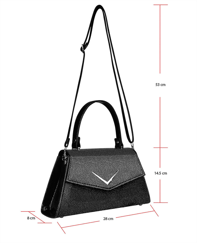 The Rumbler Vintage Classic Handbag in all black glitter.Bowling Alley and Classic Car inspired with upholstery style materials, metal flake, leopard print lining and our signature Chevron badge.